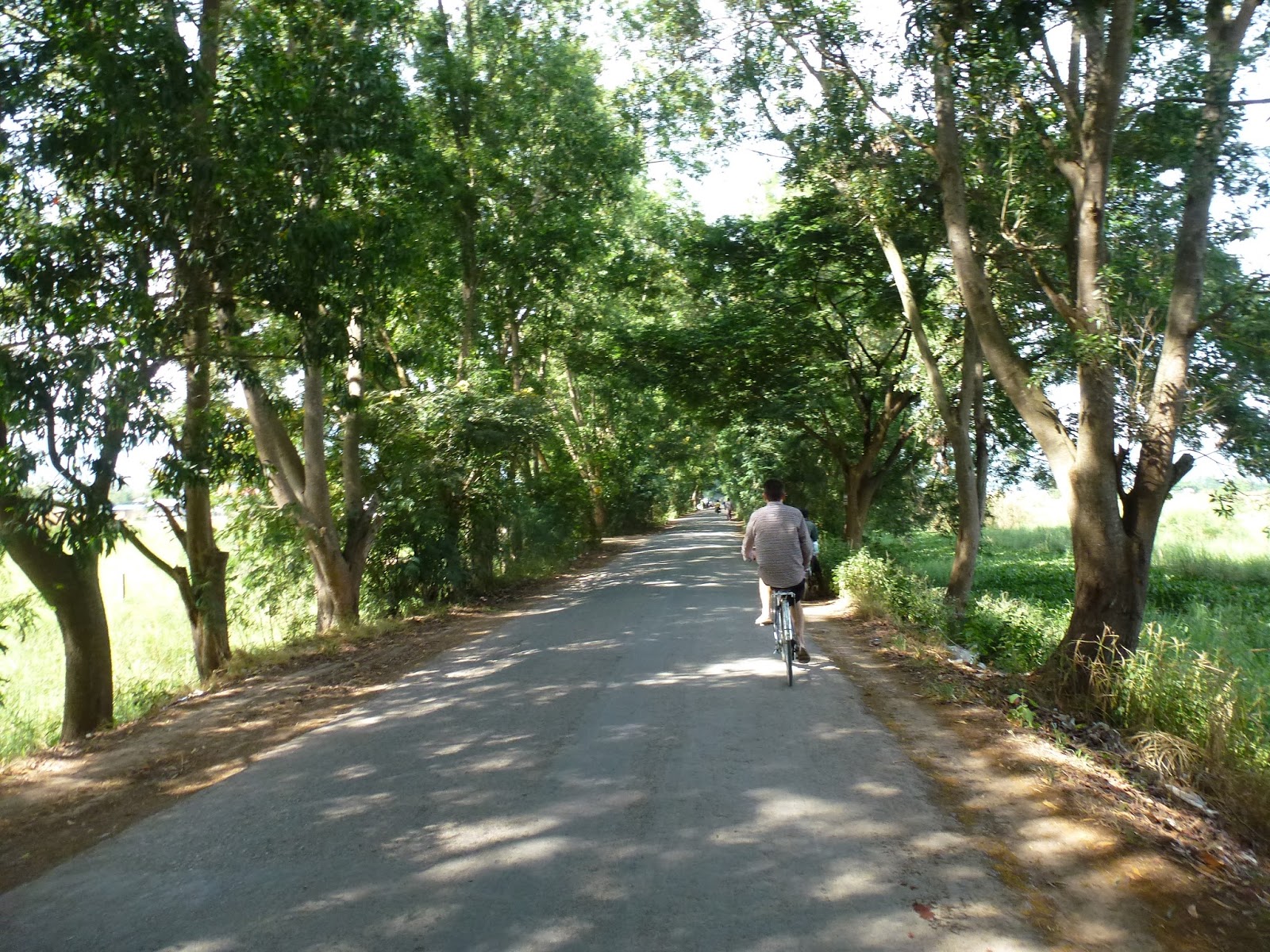 We rented bikes from the hotel and decided to follow our guidebook and take a short bike trip along the northwest side of the lake. The road is tree lined with a small brown immobile creek on either side and houses on stilts over the river. Women are washing their hair and their clothing in the river, though there is a fair amount of garbage all around. The houses appear to be made out of bamboo and some are thatched or have a tin roof. There are several wooden bridges that cross the waterway. Both sides have rice paddy fields and some have water buffalo grazing.